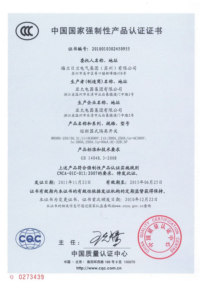 MRHR6-250熔斷隔離開關(guān)資質(zhì)證書