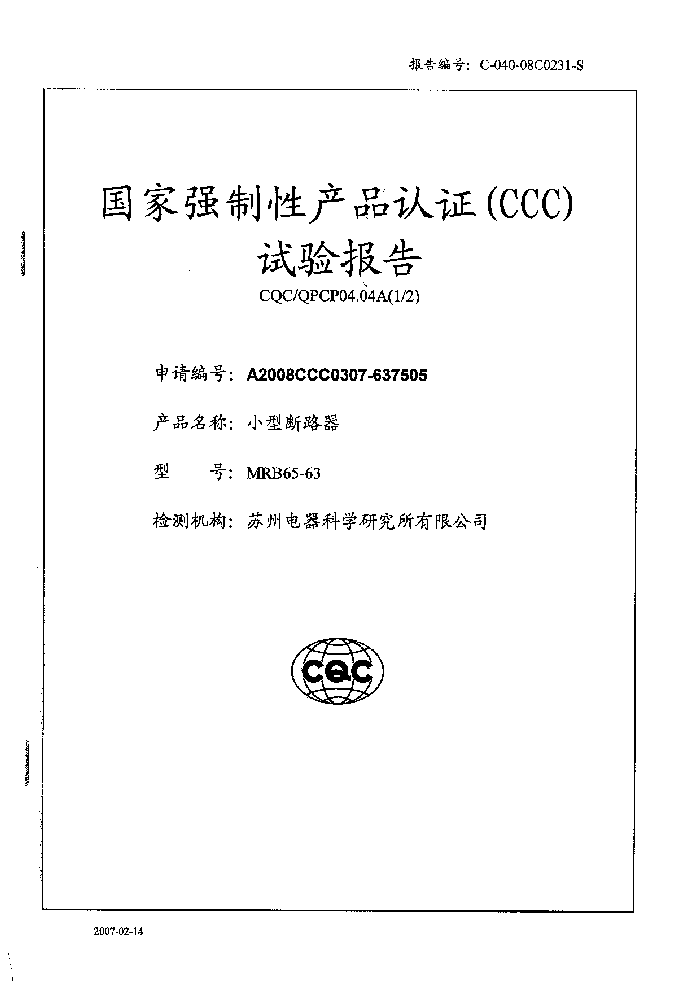 MRB65-63小型斷路器資質(zhì)證書