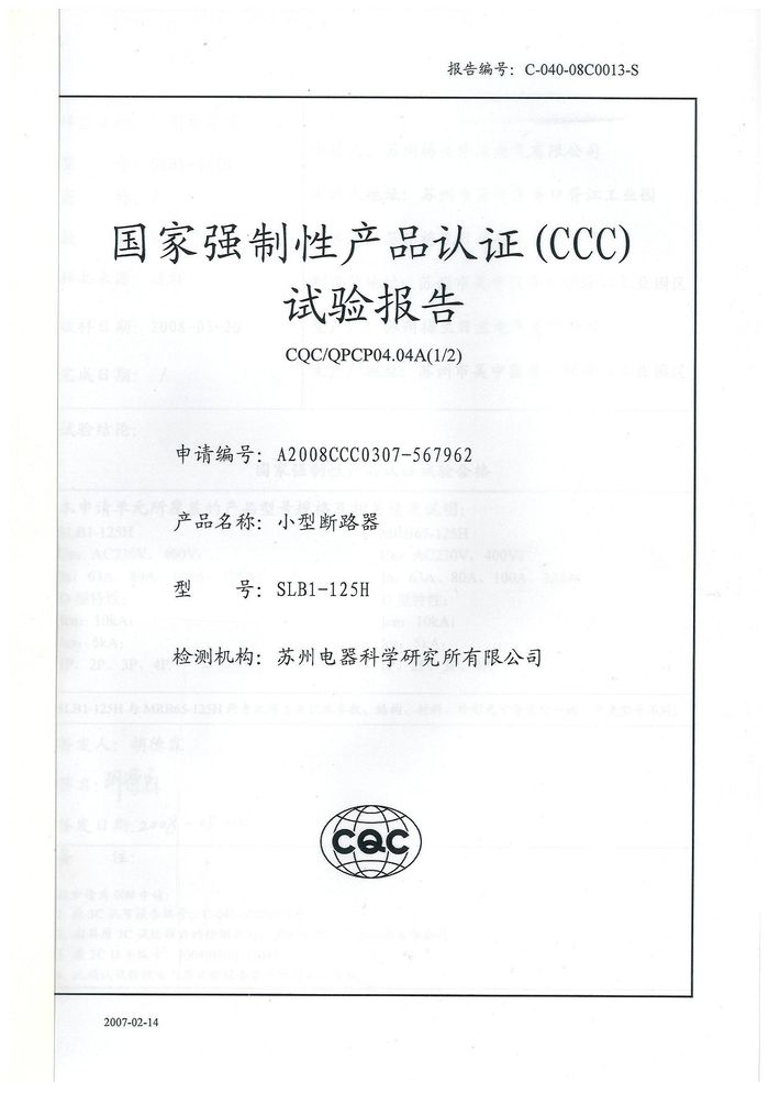 SLB1-125H小型斷路器資質(zhì)證書