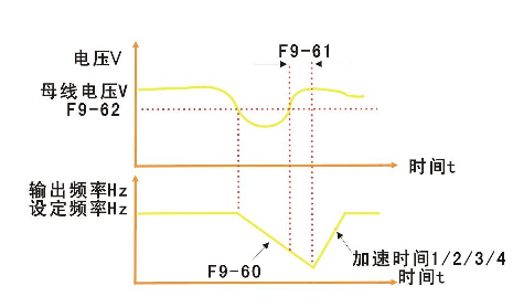 此功能指在瞬時(shí)停電時(shí)變頻器不會(huì)停機(jī),在瞬間停電或電壓突然降低的情況下,變頻器降低輸出速度,通過負(fù)載回饋能量,補(bǔ)償電壓的降低,以維持變頻器短時(shí)間內(nèi)繼續(xù)運(yùn)行。