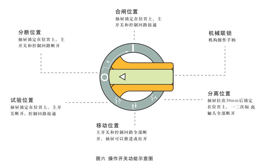 抽屜插入后,將手柄順時針方向轉(zhuǎn)動時,首先到達(dá)“試驗(yàn)位置”(↓),此時機(jī)構(gòu)將外部電源引入控制回路,用戶通過面板上的安全電器(假如有的話)對電路進(jìn)行試操作,以確認(rèn)其是否符合要求,由于主開關(guān)尚處于斷開狀態(tài),因此一次回路處于無電狀態(tài),即使操作結(jié)果與要求不符也不會損壞設(shè)備,繼續(xù)順時針方向轉(zhuǎn)動到手柄處于水平位置時,即“分?jǐn)辔恢?rdquo;(0)。此時一次和二次回路均處于無電狀態(tài),沿順時針方向繼續(xù)旋轉(zhuǎn)90°則手柄轉(zhuǎn)到“合閘位置”(I),見圖六。